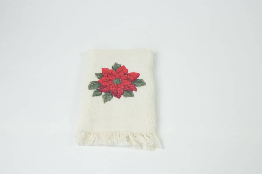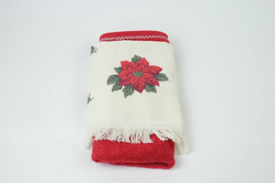 Christmas two-piece set of 100% Cotton towels combo. Featuring the plain red hand towel with chain border combine with Poinsettia flower print fingertip brings an updated look to any decor on any occasion. Thick and super absorbent, lightweight towel offers comfort and style. Dimension towel -16″x23″ and 12″x18″.